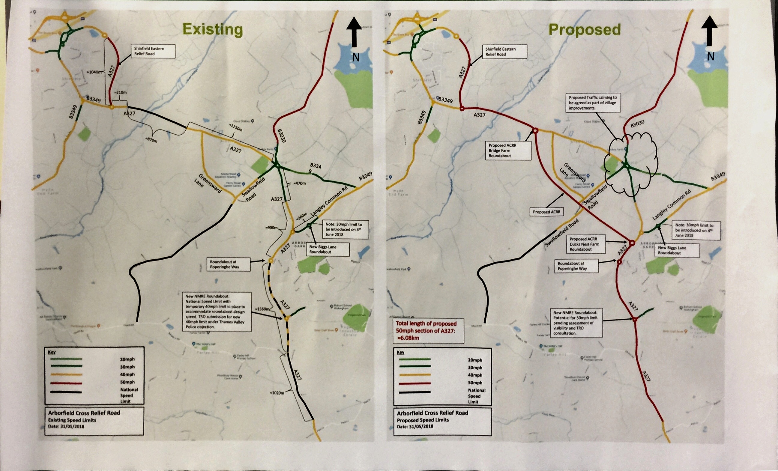 The other council display was about the upcoming Arborfield Relief Road – the plans for this have been pretty stable for a number of months, but the more interesting part was the ongoing discussion over speed limits. As you may be aware there is currently a temporary 40mph speed limit from the Poperinghe Way roundabout down to the Church Road turn up to Farley Hill. This was always planned to be made permanent, indeed the Nine Mile Ride Extension Roundabout was designed and built for traffic to take it at 40mph. However the map the council had on display highlighted that Thames Valley Police had objected to the speed limit being cut to 40mph, so the council had a new plan that once the Arborfield Relief Road is open regularises the speed limit along the length of the A327 from the edge of Finchampstead to the Shinfield Science Park to 50mph. This involves cutting the limit from 60mph in some places and raising the 40mph in others, most notably past Poperinghe Way and the current pedestrian crossing before the new relief road splits off. In general having a consistent limit seems like a good idea rather than the current limits that change up and down, however we do think the council needs to look carefully at the crossing by Poperinghe Way as we know people already have experience of traffic on the A327 not stopping at those lights, so much as with the new Relief Road where the footpath is being put on a bridge, an alternative to a road level crossing needs to be considered.